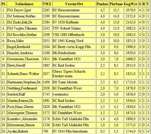 Dritter wurde Erik Zude, der in der Schlussrunde Mike Rosa niederringen konnte. Dennoch gewann Letzterer die erste Ratingklasse und wurde mit Rang 6 bester Nicht-Titelträger. Mangels Konkurrenz sicherte sich Alexander Kornilov den Jugendpreis, und Ferdinand Niebling wurde bester Senior. Die zweite Ratinggruppe entschied Thorsten Ostermeier für sich, die dritte gewann Thomas Meisegeier, der während des Turniers Vater eines gesunden Jungen namens Jonas wurde. Der Preis in Ratinggruppe Numero 4 wurde sichere Beute von Dr. Stephan Hartmann. Es folgt die entscheidende Partie der fünften Runde: