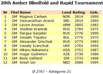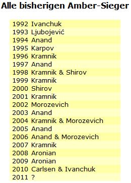 05.01.2011 - Das 20. Amber Chess Tournament stellt nicht nur ein Jubiläum dar, es wird zugleich auch das letzte seiner Art sein. Noch einmal werden zwölf Top-GM Mitte März gegen einander Schnell- und Blindschach spielen. Wir haben für Sie das Teilnehmerfeld und ein paar weitere Infos.