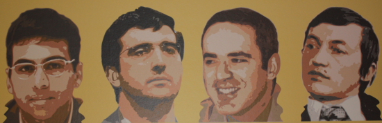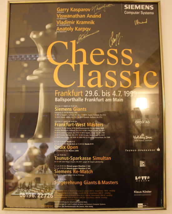 Im Spiegel der Glasscheibe sieht man die Chess960-Spieler und auf dem signierten Plakat wird an 1999 erinnert, als die letzten vier (offiziellen) Weltmeister gemeinsam in Frankfurt am Main bei der Chess Classic spielten