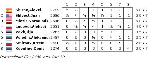 Tallinn (EST) - Zu Ehren der estnischen Legende Paul Keres (*7. Januar 1916; †5. Juni 1975) fand vom 07. bis 09. Januar das Keres Memorial statt. Keres gilt bei vielen Schachfans als der stärkste Spieler, der niemals Weltmeister wurde. Das Gefühl, kurz vor dem Ziel bei einer WM zu scheitern, kennt auch Alexei Shirov, doch am vergangenen Wochenende war der gebürtige Lette nicht nur der klare Favorit, er gewann das Schnellturnier auch. Zunächst wurde eine Vorrunde gespielt, in welcher sich Artem Smirnov, Denis Kovaljov, Normunds Miezis und Aleksei Lugovoi für die Finalrunde qualifizierten. Diese hätte dann mit eben Alexei Shirov, Jaan Ehlvest, Elshan Moradiabadi und Aleksandr Volodin aufgefüllt werden sollen, aber Moradiabadi schaffte es nicht, von der Iranischen Meisterschaft (bei welcher er Zweiter hinter Ehsan Ghaem Maghami wurde) anzureisen, und so kam der Este FM Ilja Vovk zu dem großen Vergnügen, einspringen zu dürfen. Mit 50 Prozent gelang ihm dann auch noch ein ausgezeichnetes Ergebnis. Doch dominiert wurde das Turnier erwartungsgemäß von Shirov, der 6/7 erzielte und souverän gewann.