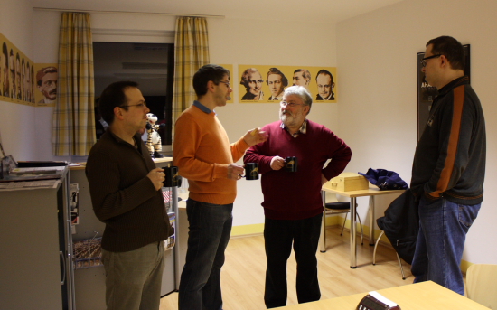 Vor dem Start um 19 Uhr stand erstmal Kaffee-Doping auf dem Programm von links: Christof Goll, FM Alexander Armbruster, Hans-Walter Schmitt und IM Stefan Reschke