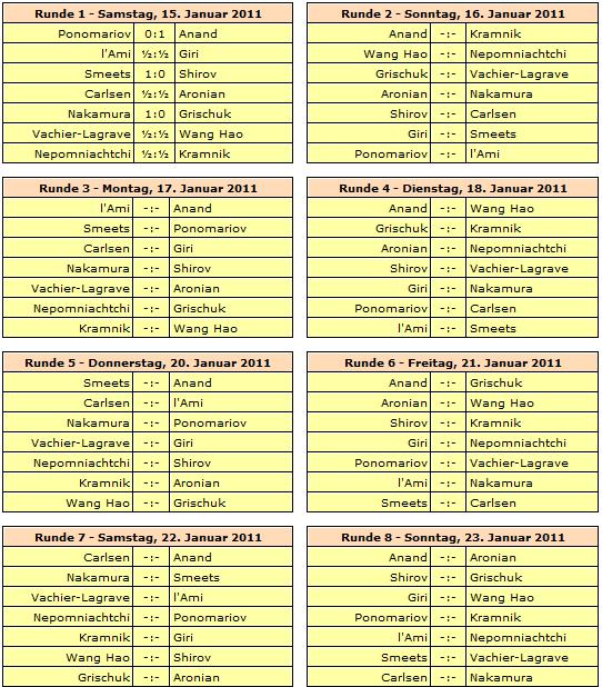 TopTurniere Tata Steel 2011 - Anand, Nakamura und Smeets legen vor Vier Siege in der B-Gruppe und zwei faustdicke Überraschungen in der C-Gruppe
