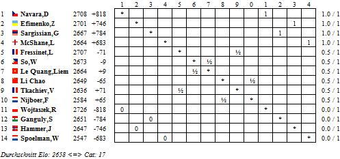 In der B-Gruppe hat sich ein Quartett an die Spitze gesetzt. Im Duell der Favoriten konnte David Navara gegen Anand-Sekundant Radek Wojtaszek gewinnen, Luke McShane bestätigte seine gute Form aus London mit einem Sieg gegen Wouter Spoelman, und Gabriel Sargissian schlug Surya Ganguly. Den glücklichsten Sieg landete Zahar Efimenko, denn sein Gegner schaffte es nicht, das Endspiel Turm gegen Turm plus Läufer remis zu halten.
