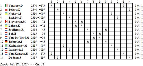 Aus der C-Gruppe gibt es gleich zum Auftakt zwei besonders bemerkenswerte Ergebnisse zu vermelden. Der aktuell jüngste Großmeister auf der Welt Ilya Nyzhnyk schlug mit Murtas Kazhgaleyev den einen 2600er im Feld, und die Inderin IM Tania Sachdev tat es ihm gegen den anderen in Person von Ivan Ivanisevic gleich. Den dritten Sieg dieser Gruppe landete der polnische Großmeister Dariusz Swiercz gegen IM Jan Willem de Jong, und zu guter Letzt konnte GM Daniele Vocaturo gegen IM Robin van Kampen ein Ausrufezeichen setzen. Der einzige deutsche Vertreter in Wijk aan Zee, GM Sebastian Siebrecht, startete mit einem Remis gegen IM Roeland Pruijssers in die C-Gruppe, wobei er einem Sieg durchaus nahe kam.