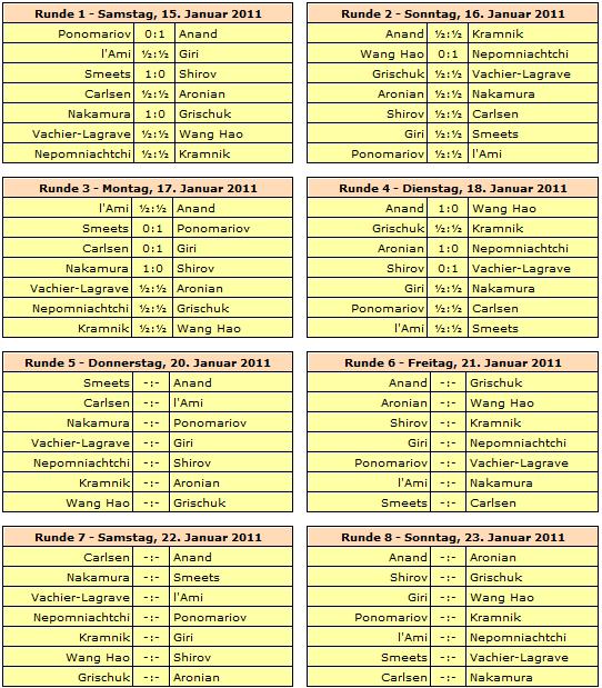 18.01.2011 - Nach der vierten Runde der A-Gruppe beim Tata Steel Chess Tournament in Wijk aan Zee hat Weltmeister Viswanathan Anand erneut die Tabellenführung erobert. Mit einer starken Neuerung in der Sämisch-Variante des Nimzoinders überraschte der Inder den Chinesen Wang Hao und fuhr einen überzeugenden Sieg ein. Schneller war da nur Levon Aronian nach einem kapitalen Verrechner von Ian Nepomniachtchi. Wenn man es ganz genau will, hätte der Russische Landesmeister bereits nach nur 10 Zügen aufgeben können, aber aus verständlichen Gründen zögerte er das Ende noch bis zum 26. Zug hinaus. Völlig außer Form ist offenkundig Alexei Shirov, der gegen den Franzosen Maxime Vachier-Lagrave taktisch den Kürzeren zog. Die längste Partie der vierten Runde war die zwischen Anish Giri und Hikaru Nakamura. Der 16-Jährige setzte dem Amerikaner mächtig zu, aber letztlich konnte dieser ein Turmendspiel mit Minusbauer erreichen und dieses remis halten. Somit führen nun gemeinsam Vishy und Naka vor Aronian, Giri und Vachier-Lagrave mit einem halben Zähler Rückstand.