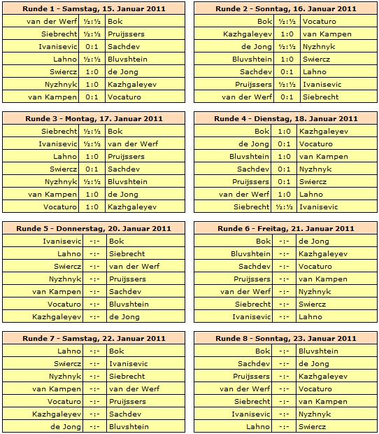 In der C-Gruppe hat Daniele Vocaturo den ersten Platz in der Tabelle eingenommen. Dafür musste er mit Schwarz Jan Willem de Jong schlagen, was ihm auch gelang. Zurückgefallen ist dagegen Kateryna Lahno nach ihrer Niederlage gegen IM Mark van der Werf. Sehr spannend war auch wieder die Partie von Sebastian Siebrecht. Der Deutsche geriet aus der Eröffnung in eine schwierige Lage, doch mit Hilfe seines Gegners Ivan Ivanisevic erarbeitete er sich letztlich ein verdientes Remis und darf somit bisher ungeschlagen den Ruhetag genießen.