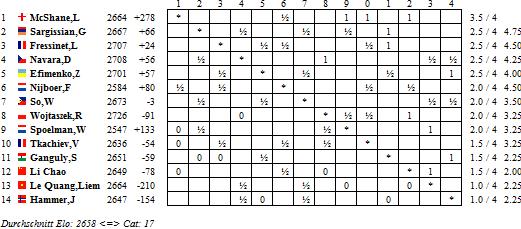 Die B-Gruppe führt nicht überraschend weiterhin Luke McShane an. Vor der vierten Runde hatte der Brite bereits einen ganzen Punkt Vorsprung auf die unmittelbare Konkurrenz, so dass ihm heute das Remis gegen Friso Nijboer völlig reichte, um vor dem morgigen Ruhetag alleine an der Spitze zu bleiben. Mit seinem Sieg über Surya Ganguly konnte Laurent Fressinet in die Verfolgergruppe einziehen, die jedoch weiterhin einen vollen Zähler Rückstand hat.
