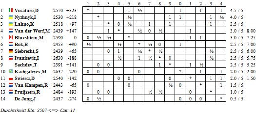 Und auch in der C-Gruppe gibt es einen alleinigen Spitzenreiter. Daniele Vocaturo bezwang Mark Bluvshtein und das war auch nötig, um alleine vorne zu bleiben, denn Youngster Illya Nyzhnyk konnte parallel gegen Roeland Pruijssers voll punkten. Und auch Kateryna Lahon ist weiterhin eine zähe Verfolgerin des Italieners. Daran hat leider auch Sebastian Siebrecht seinen Anteil, denn der Deutsche verlor heute gegen die junge Ukrainerin und notiert aktuell mit 50 Prozent nach Wertung den 7. Rang.