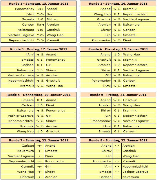 TopTurniere Tata Steel 2011 - Schwarzer Freitag in Wijk aan Zee Sechs entschiedene Partien in B-Gruppe Vocaturo verliert gegen Sachdev in C-Gruppe