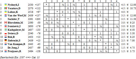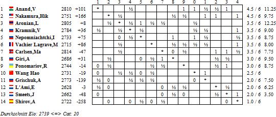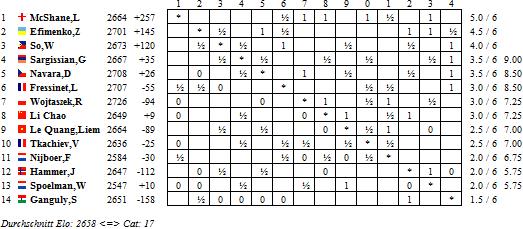 In der B-Gruppe wurde heute ebenfalls wieder eine Menge Blut vergossen, genauer gesagt, endete nur eine Begegnung unentschieden. Allen voran konnte Luke McShane gegen Radoslav Wojtaszek wieder voll punkten und somit seine alleinige Führung behaupten. Doch sein ärgster Verfolger Zahar Efimenko ließ sich ebenfalls nicht lumpen und legte gegen Wouter Spoelman nach. Alleiniger Dritter ist nun Wesley So, welcher gegen Laurent Fressinet triumphierte.