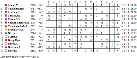 23.01.2011 - Für Hikaru Nakamura stand nach seiner Niederlage gegen Magnus Carlsen in der achten Runde der A-Gruppe beim Tata Steel Chess Tournament fest, dass heute er gegen jeden in jeder Eröffnung verloren hätte. So zumindest lautet sein Statement bei Twitter, nachdem er die alleinige Führung abgeben musste. Punktgleich, doch mit besserer Wertung liegt nunmehr wieder der Weltmeister vorn. Viswanathan Anand remisierte mit Weiß gegen Levon Aronians spanischen Marshall-Angriff und ist damit wohl weiterhin der Favorit auf den Turniersieg. Doch gleich vier Spieler liegen nur einen halben Zähler zurück hinter dem Inder und dem Amerikaner. Mit seiner bereits vierten Niederlage in Serie verhalf Jan Smeets unfreiwillig Maxime Vachier-Lagrave zum Sprung in die Verfolgergruppe, während Vladimir Kramnik gegen Ruslan Ponomariov den Punkt teilte. Nach zwei Niederlagen konnte Anish Giri wieder einen vollen Punkt feiern. Der Wahl-Niederländer besiegte Wang Hao. Und auch Alexei Shirov dürfte heute ein Stein vom Herzen gepurzelt sein, nachdem er Alexander Grischuk bezwungen hatte. Experten vermuten ja, Grischuk halte seine Eröffnungen für die WM-Kandidatenmatches zurück, aber vielleicht hat er auch ganz einfach nur ein schlechtes Turnier erwischt.