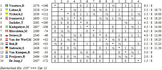 Nach einer kurzen Schwäche in der sechsten Runde hat Daniel Vocaturo die C-Gruppe wieder fest im Griff. Der Italiener schlug Mark van der Werf und hat nun wieder einen ganzen Punkt Vorsprung auf die Konkurrenz, da Illya Nyzhnyk gegen Ivan Ivanisevic die erste Niederlage im Wettbewerb quittieren musste. Sehr erfreulich aus deutscher Sicht ist, dass Sebastian Siebrecht (Bild) mal wieder voll punkten konnte. Der Essener bezwang Robert van Kampen, stoppte so den Abwärtstrend der drei zurückliegenden Runden und hat sein strahlendes Siegerlächeln wiedergefunden.