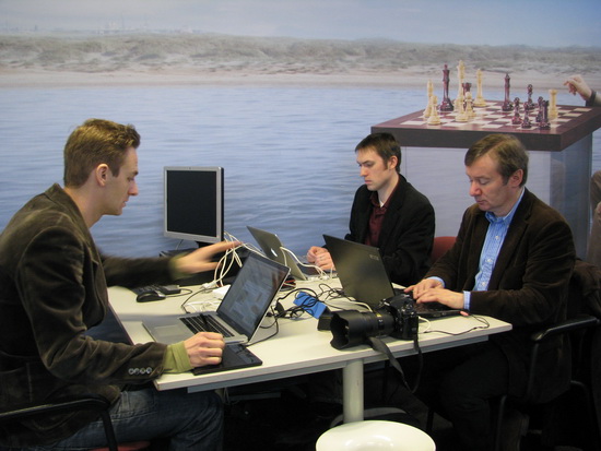 Die Presse fleißig bei der täglichen Arbeit von links: Peter Doggers (ChessVibes), Macauley Petersson (ICC) und Jan ten Geuzendam (New in Chess) ...