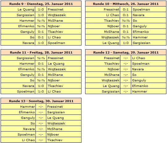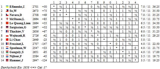 In der B-Gruppe ist nur Eines klar, nämlich, dass gar nichts klar ist. Zwei Runden vor dem Ende führen gleich vier Spieler die Tabelle an, weshalb es schon jetzt Sinn macht, mal auf die Regeln für Punktgleichheit am Ende einzugehen. Die besagen, dass zunächst der direkte Vergleich entscheidet, dann die Sonneborn-Berger-Wertung, dann die Anzahl der Schwarzpartien und zu guter Letzt die Zahl der Siege. Es führen Zahar Efimenko, Wesley So, David Navara und Luke McShane, doch schon im morgigen Spitzenduell zwischen McShane und So könnte mindestens einer aus der Gruppe ausscheiden.