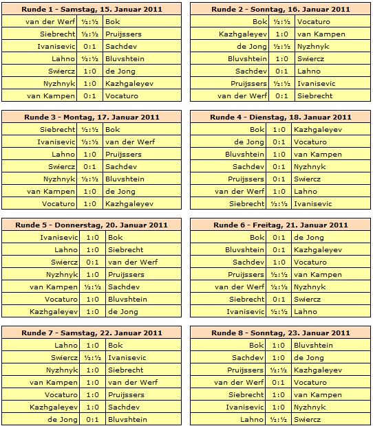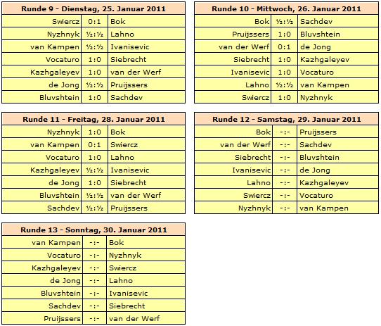 So gut wie entschieden ist in Sachen Turniersieg dagegen die C-Gruppe. Zu deutlich dominiert Daniele Vocaturo, der sich heute an seiner ärgsten Verfolgerin Kateryna Lahno schadlos hielt und nun wieder 1,5 Punkte Vorsprung - jetzt auf Illya Nyzhnyk - hat. In der letzten Runde werden beide übrigens aufeinander treffen. Eine Achterbahn der Gefühle dürfte Sebastian Siebrecht durchmachen. Nachdem er in der 10. Runde noch über Murtas Kazhgaleyev hergefallen war, schenkte ihm heute Jan Willem de Jong nicht minder kräftig ein und schlug den einzigen deutschen Profi in Wijk aan Zee.