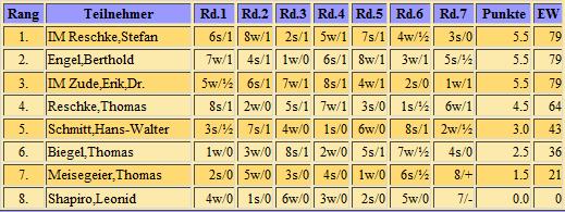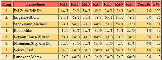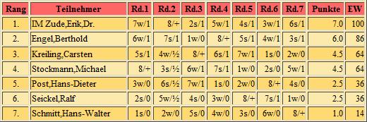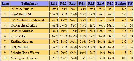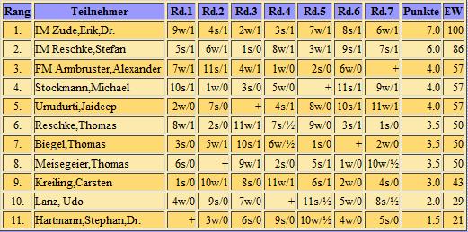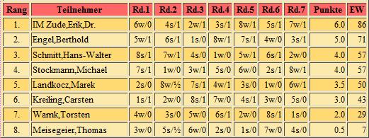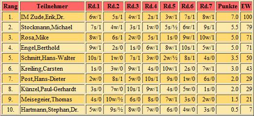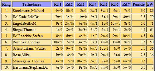 Endabrechnung addiert; 7 Runden Schweizer System, Bedenkzeit: 10 Minuten plus 5