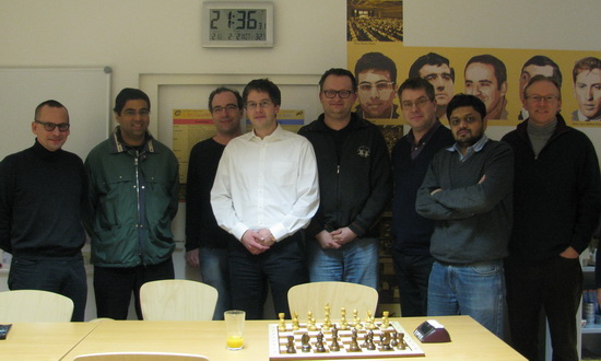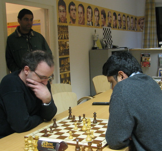 03.02.2011 - Da haben die Teilnehmer an der aktuell laufenden Schnellschach Rally im Herzen von Bad Soden am Taunus nicht schlecht gestaunt, als plötzlich der amtierende Weltmeister im Rahmen stand. Gerade hatte er noch in Wijk aan Zee Weltklasseschach gezeigt, dann einen kurzen Abstecher nach Spanien gemacht, um ein paar Showpartien gegen Anatoly Karpov zu spielen, und nun ist Viswanathan Anand wieder in seiner deutschen "Zweitheimat". Nach so viel Selberspielen wollte Vishy mal nur zuschauen und begab sich gestern in das Chess Tigers Training Center, wo die vierte Etappe der B9 Classic Rally ausgetragen wurde und brachte sogar noch einen starken Teilnehmer mit. Der Inder Jaideep Unudurti kann nicht nur sehr passabel Schachspielen (Rating um die 2000), er arbeitet auch an einem Buch über seinen großen Landsmann. Das Turnier selbst gewann souverän IM Erik Zude, doch dieses Mal gebührt besonders unserem Thomas Meisegeier ein dickes Lob. Unter den Augen des Weltmeisters erzielte er mit 50 Prozent sein bisher bestes Ergebnis und schlug dabei ausgerechnet den Gast aus Indien! Ein Viertel sowohl der Classic Rally als auch der Chess960 Rally ist bisher gespielt. Zeit, Ihnen sämtliche Tabellen und Zwischenstände nebst exklusiven Bildern zu präsentieren. Wer bisher noch nicht mitgespielt hat, aber dennoch gerne eine oder sogar beide Rallys gewinnen möchte, sollte unbedingt am kommenden Montag zur fünften Etappe der Chess960 Rally anwesend sein! Im Augenblick sieht es in beiden Wettbewerben nach einem einsamen Durchmarsch von Hausherr Erik Zude aus.