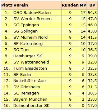 In Bremen könnte eine Vorentscheidung um die deutsche Meisterschaft fallen. Bremen empfängt in der 10. Runde den SV Mülheim Nord zum Spitzenspiel des gesamten Wochenendes. Bei zwei Punkten Rückstand auf OSG Baden-Baden dürfen sich die "Grün-Weißen" keinen Ausrutscher mehr erlauben, um sich noch Chancen auf den Titel auszurechnen. Da die Fußballabteilung des Vereins am Sonntag gegen Bayer Leverkusen antritt, wird ausnahmsweise nicht im Weserstadion gespielt. Mit dem Swissotel, in der Nähe vom Bahnhof, wurde aber ein würdiger Ersatz gefunden. Ihr Autor wird vor Ort sein und insbesondere vom Spitzenspiel berichten. In den restlichen Kämpfen sind die Favoritenrollen klar verteilt. Die Westvereine Mülheim und Katernberg rechnen mit einem Sieg gegen den designierten Absteiger Delmenhorst.