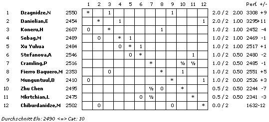 Doha (KAT) - Seit dem 22. Februar und noch bis zum 05. März findet in dem arabischen Emirat Katar der 6. Women's FIDE Grand Prix statt. Die Turnierserie soll die diesjährige Herausforderin von Weltmeisterin Hou Yifan ermitteln, welche ihrerseits die GP-Wertung anführt, aber natürlich nicht mehr selbst teilnimmt. Gespielt wird ein elfrundiges Rundenturnier, wobei der Georgierin Nana Dzagnidze derzeit die besten Chancen eingeräumt werden, im Match um die Krone des Frauenschachs antreten zu dürfen. In der ersten Runde jedenfalls untermauerte sie ihre Ambitionen gleich mal mit einem Sieg gegen die einzige 2600erin im Feld, Humpy Koneru aus Indien. In der zweiten Runde legte Dzagnidze nach und schlug Batkhuyag Munguntuul aus der Mongolei. Diesem flotten Anfangstempo kann aktuell nur die Armenierin Elina Danielian folgen, welcher ebenfalls zwei Siege gelangen. Insgesamt zeigen sich die Frauen erneut von ihrer kämpferischen Seite. In beiden Runden endete jeweils nur eine Partie unentschieden.