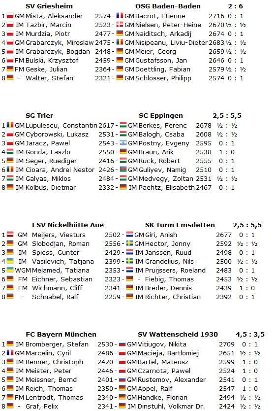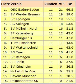 27.02.2011 - Auch in der elften Runde der laufenden Schachbundesligasaison dominierten die Favoriten auf den Titel ihre Gegner klar. Baden-Baden wiederholte mit dem 6:2 gegen Trier exakt das Ergebnis von gestern, und Bremen legte beim 6,5:1,5 gegen Katernberg sogar noch eine Schüppe drauf. Eppingen ging es beim 5:3 gegen die Griesheimer etwas ruhiger an, und die Solinger wahrten den Anschluss mit einem 5,5:2,5 gegen Berlin. Das höchste Ergebnis des Wochenendes erzielten die Mühlheimer gegen den designierten Absteiger Delmenhorst. Am Ende hieß es 7,5:0,5. Das nächste Mal wird am 19. und 20. März in der Bundesliga gespielt, bevor es in der 14. Runde am 09. April in Baden-Baden zum Showdown zwischen der OSG und den Werderanern kommt.