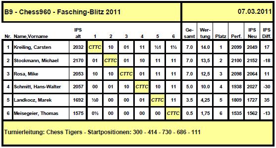 Morgen um 19:00 Uhr wird im Training Center erneut geblitzt. Dieses Mal lautet der Name Classic Aschermittwoch Blitzturnier, was bedeutet, dass sich die Figuren am Anfang in der bekannten Aufstellung befinden werden. Wenn man so will, dann ist es ein Chess960-Thematurnier in der Startposition 518. Jedermann ist willkommen, und es wird wieder kein Startgeld erhoben.