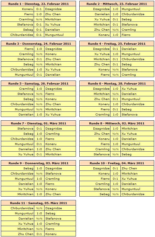 08.03.2011 - Einen riesigen Schritt gen WM-Titel hat die Inderin Humpy Koneru am vergangenen Samstag geschafft. Beim 6. Women's FIDE Grand Prix in Doha wurde sie in einem spannenden Finale Wertungssiegerin und schaffte die ersehnte Qualifikation für das nächste WM-Match der Frauen. Derweil gibt es Neuigkeiten von einem anderen Weltmeister, nämlich vom großen Bobby Fischer. Ein isländisches Gericht sah es als erwiesen an, dass Miyoko Watai die Ehefrau Fischers war und sprach ihr dessen Erbe zu. Deutlich spaßiger als dieser Erbstreit war natürlich das gestrige Chess960 Fasching-Blitzturnier im Chess Tigers Training Center. In einem Wimpernschlagfinale konnte sich letztlich Carsten Kreiling durchsetzen. Am Mittwoch steht das für alle offene Classic Aschermittwoch Blitzturnier im traditionellen Schach an.