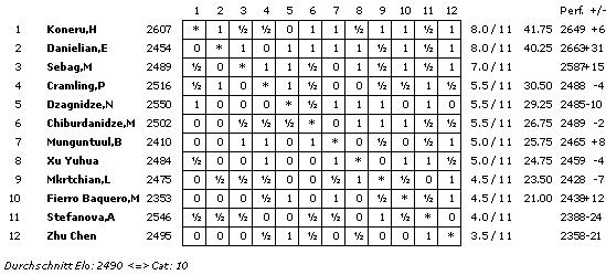 Letztlich entschieden nur 8,3 Grand Prix-Punkte gegen Nana Dzagnidze, welche vor dem 6. Women's FIDE Grand Prix in Doha als Favoritin für den zweiten Rang galt. Die Georgierin begann auch verheißungsvoll, während Koneru eher schwer in Fahrt kam. Aber mit fortschreitendem Turnierverlauf wurde die Inderin immer stärker und zog in der Schlussrunde nach Punkten sogar noch mit der überraschend stark aufspielenden Elina Danielian gleich, welche das komplette Turnier von der Spitze aus dominiert hatte. Somit besteht die nicht unrealistische Chance, dass sich gegen Ende des Jahres Indien gleich über zwei amtierende Schachweltmeister freuen darf.