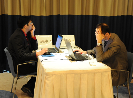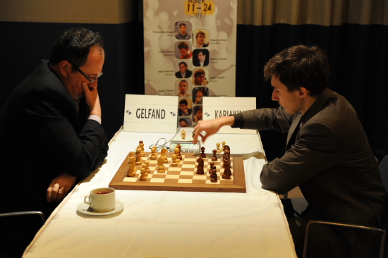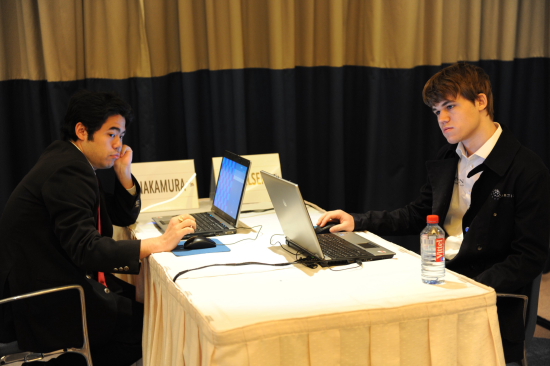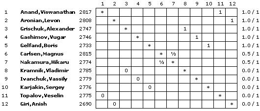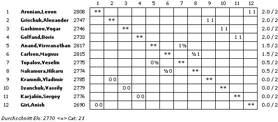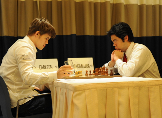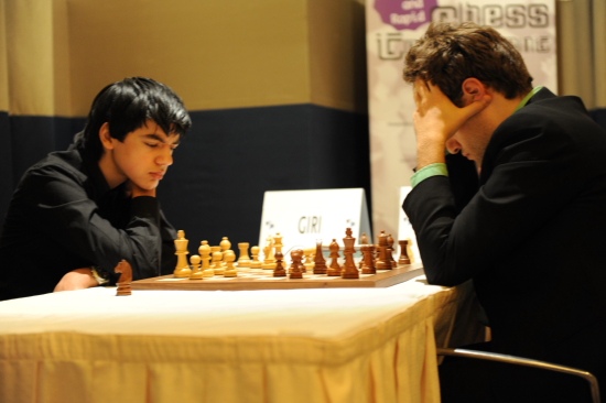 12.03.2011 - Heute fiel der offizielle Startschuss für das 20. Amber Chess Tournament. Begonnen wurde traditionell mit Blindschach, und die zahlreichen Kiebitze bekamen sogleich einige "Überseher" serviert. Besonders geärgert haben dürfte sich Anish Giri, denn dieser hatte gegen Levon Aronian mit Dame für zwei Läufer eine glatte Gewinnstellung erreicht, aber der findige Armenier sorgte so lange für maximale Verwirrung, bis sein junger Gegner schließlich einbrach und tatsächlich noch verlor. Mit großer Spannung war auch das zweite Aufeinandertreffen zwischen Weltmeister Viswanathan Anand und Veselin Topalov seit der WM 2010 in Sofia erwartet worden. Anand erreichte in der Blindpartie die bessere Stellung, gewann im Endspiel einen Bauern und letztlich auch die Partie, wobei Topalov am Ende vermutlich eine Chance zum Remis verpasste. Unter dem Strich wurden fünf der sechs heutigen Blindpartien entschieden, lediglich Hikaru Nakamura und Magnus Carlsen trennten sich nach hartem Fight unentschieden, wobei der Amerikaner kurz vor dem Ende gleich zweimal einzügig seinen Turm einstellte, was sein norwegischer Gegenüber jedoch genauso oft "übersah". In der ersten Schnellschach-Session dann wurden die Visiere allenthalben so richtig hochgeklappt. Giri und Aronian beispielsweise stürzten sich regelrecht aufeinander, und erneut hatte letzterer - seines Zeichens immerhin der amtierende Schnellschach-Weltmeister - die Nase vorn und gewann so sein erstes Mini-Match mit 2:0. Selbiges gelang auch Vugar Gashimov gegen Vassily Ivanchuk. Ebenfalls voll punkten konnte Carlsen gegen Nakamura. Der Chess960-Weltmeister mutete seinen König einfach zu viel zu und wurde von der Nummer 2 der Weltrangliste sehenswert überspielt. Besonders zufrieden mit dem ersten Tag dürfte auch Alexander Grischuk sein, denn ihm wurde die seltene Freude zuteil, gleich zwei Partien in Serie gegen Vladimir Kramnik zu gewinnen. Das Führungsquartett an der Spitze der Gesamtwertung komplettiert Boris Gelfand. Der Israeli schlug gegen Sergey Karjakin ebenfalls doppelt zu. Auch beim Schnellschach endete nur eine Partie remis. Anand und Topalov teilten gerecht den Punkt.