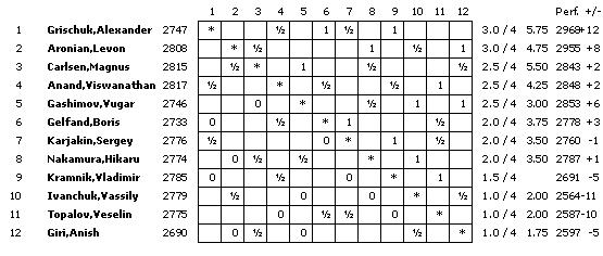 15.03.2011 - Nach vier Runden stehen Magnus Carlsen und Levon Aronian gemeinsam an der Spitze der Gesamtwertung beim 20. Amber Chess Tournament. Der Norweger gewann im Duell der Youngster gegen Anish Giri mit 1,5:0,5, was ihm Aronian gegen Vassily Ivanchuk nachmachte. Diesem Tempo scheint im Augenblick nur Weltmeister Viswanathan Anand folgen zu können. Der Inder hatte es heute mit Alexander Grischuk zu tun und nach einem Remis in der Blindpartie konnte er den Russen im Schnellschach besiegen. Die Kehrseite der Medaille stellen Ivanchuk und Giri dar. Sie sind die Einzigen, die noch keine Partie gewinnen konnten und zieren entsprechend die Enden aller Tabellen - knapp hinter Vladimir Kramnik.