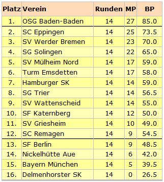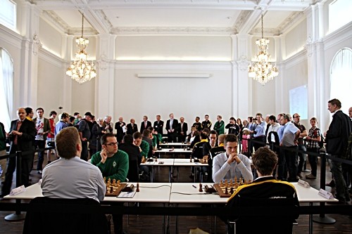 09.04.2011 - Mit einem 5:3-Sieg gegen Werder Bremen hat die OSG Baden-Baden die Mission Titelverteidigung in der Schachbundesliga zu gefühlten 99,9 Prozent vor der morgigen Schlussrunde erfüllt. Die Siege von Peter Svidler, Michael Adams und Arkadij Naiditsch machten die unglückliche Niederlage von Peter Heine Nielsen vergessen und bescheren den OSGlern mit allerhöchster Wahrscheinlichkeit den sechsten Meistertitel in Serie. Zum Abschluss treffen die Mannen von Kapitän Sven Noppes nämlich auf das klare Schlusslicht der Tabelle, Delmenhorst. Diese wiederum wurden heute von dem SC Eppingen mit 1,5:6,5 standesgemäß verarztet und es besteht kein begründeter Verdacht darauf, dass die Baden-Badener Stars bis morgen komplett das Schachspielen verlernen. Dennoch, die Glückwünsche zur erneuten Meisterschaft gibt es von Seiten der Chess Tigers aber erst morgen! Neben Delmenhorst und München steht mit Nickelhütte Aue nun auch der dritte und vorletzte Absteiger in die 2. Liga fest.