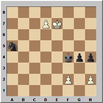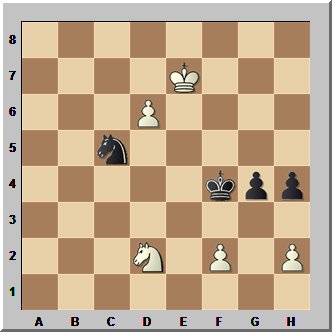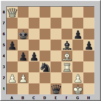 Mit Weiß am Zug sollte sich hier nur die Frage stellen, ob dieser das gewinnen kann. Was nun geschah, lässt sich vermutlich nur mit akutem Versagen der Nerven im Abstiegskampf erklären. Wer weiß, vielleicht hatte jemand Tazbir (fälschlich) darauf aufmerksam gemacht, dass er gewinnen müsse, um den Erhalt der Klasse zu sichern, jedenfalls packte dieser eine Gewinnkombination aus, die selbst in unteren Spielklassen für völliges Unverständnis gesorgt hätte. Er spielte 51.Sb3?? und realisierte vermutlich erst nach dem umgehenden 51...Sxb3, dass nach 52.d7 Sa5 der Bauer zwar zur Dame wird, aber dann Sc6+ folgt.