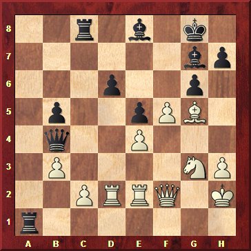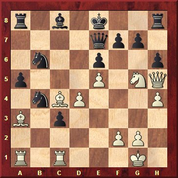 Schwarz zog gerade 18…h6 und droht, mit 19…g6 die Dame zu behelligen, wonach der Springer geschlagen werden könnte. 19.Txc3?? Weiß übergeht einfach die schwarze Drohung. Arik Braun erzählte nach der Partie, dass er plötzlich 19…g6 sah. Er lief rot an und verließ das Brett. Ein schöner Bluff. 19…0-0?? Und Schwarz verzichtet auf 19…g6! Nach 20.Lb5+ Kf8! 21.Sxe6+ Lxe6 22.Df3 Kg7 hätte Raykhman eine Figur mehr gehabt. Nach 19…0-0 steht er aber auf Verlust. Der weiße Angriff ist nicht mehr zu parieren. 20.Se4 S6d5 20…Sxc4 21.Sf6+! Kh8 22.Lc1! mit der Idee 23. Lxh6 gewinnt. 21.Lxd5 exd5 22.Sf6+ gxf6 23.Tg3+ und Schwarz gab auf, da er nach 23…Kh7 24.Lc1! matt gesetzt wird. 1-0