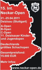23.04.2011 - In der 4. Runde des 15. Int. Neckar-Opens mussten die Favoriten kräftig Federn lassen. Die größte Überraschung gelang Twan Burg. Der holländische IM bezwang den Top-Favoriten auf den Turniersieg, Etienne Bacrot. Burg gelang es, seinen prominenten Gegner in einer sizilianischen Partie gehörig unter Druck zu setzen. Bacrot verteidigte sich im Laufe der Partie unsauber und musste kurz nach der ersten Zeitkontrolle die Waffen strecken.