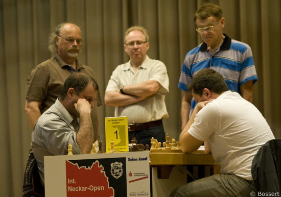 24.04.2011 - Das hat auch das größte und stärkste Open auf deutschem Boden noch nicht allzu oft erlebt. Gleich drei einheimische Spieler belegen die ersten drei Plätze beim 15. Int. Neckar-Open und das nach bereits 7 gespielten Runden. Mit makelloser Weste führt Arkadij Naiditsch, nachdem er gegen den Israeli Alon Greenfeld seinen siebten Sieg in Serie hinlegte. Rang 2 hält nach wie vor David Baramidze nach seinem Sieg gegen Grzegorz Gajewski aus Polen. Arik Braun ist der Dritte im Bunde. Er verlor nur gegen Naiditsch und konnte ansonsten alle seine Partien gewinnen - zuletzt gegen IM Luca Shytaj aus Italien. In der vorletzten Runde kommt es am Ostermontag zum Duell zwischen Naiditsch und Baramidze. Sollte Ersterer siegen, ist ihm der Turniersieg nicht mehr zu nehmen. Endgültig ausgeschieden aus dem Titelrennen ist mit Etienne Bacrot die Nr. 1 der Setzliste. Der Franzose leistete sich in komplizierter Stellung gegen IM Oleg Spirin aus Russland einen kapitalen Einsteller und verlor. Es folgt der aktuelle Tabellenstand und der Bericht von Georgios Souleidis mit Bildern vom Pressechef und Christian Bossert.
