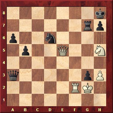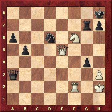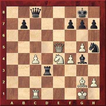 38…Sf5!! Diesen Knaller muss Weiß übersehen haben. Der Springer auf f5, der die Grundreihenschachs aus dem Spiel nimmt, ist tabu. 39.Tf1? Ein zweiter grober Fehler direkt hinterher, der es Schwarz einfach macht. Die schwarze Dame nähert sich mit Schachs an und der g-Bauer entscheidet. 39.Txf5? Da2+ 40.Kf3 Df2+ 41.Ke4 De2+ 42.Kd5 Dxe5+ 43.Kxe5 g2-+; 39.De8+! war der einzige Weg, die Partie am Laufen zu halten. Nach 39…Tg8 40.De5+ Sg7 kann Weiß noch kämpfen, da sich Schwarz dieser lästigen Fesselung erstmal entziehen müsste. 39…Da2+ 40.Kf3 Db3+ 41.Ke2 Dc4+ 42.Ke1 g2 43.Tg1 Dh4+ 0-1