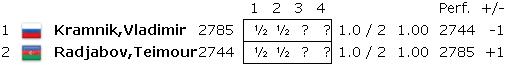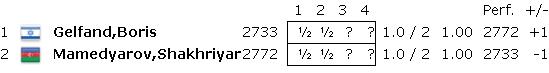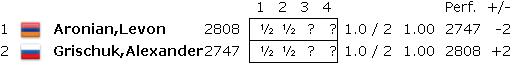 06.05.2011 - Man kann nach Kräften spekulieren, ob Veselin Topalov zu riskant eingestellt ist gegen einen Gata Kamsky, den er in der Vergangenheit stets gut im Griff hatte, jedenfalls liegt die Vermutung nahe, dass die Neuerung 9.0-0-0 des Bulgaren im Grünfelder wenig Nachahmer finden wird. Dazu noch eine völlig abseits stehende Dame auf a3 und schon kristallisierte sich alsbald ein klarer Vorteil für Kamsky heraus, welchen der Amerikaner auch sehr souverän zum Sieg verwertete. Damit führt Kamsky zur Halbzeit mit 1,5:0,5 und hat beste Chancen auf die nächste Runde. Zuvor hatten trotz langem Grübeln Alexander Grischuk und Levon Aronian erneut den Punkt geteilt, nachdem Kommentator Klaus Bischoff den Armenier in Schwierigkeiten gesehen hatte. Doch nach 22 Zügen glaubte Grischuk nicht mehr an einen Sieg und sein Remisangebot wurde gerne angenommen. Das nächste Remis ereignete sich zwischen Boris Gelfand und Shakhriyar Mamedyarov. Zwischenzeitlich sah es zwar mal nach einem deutlichen Vorteil für den Israeli aus, doch sein aserbaidschanischer Gegner verteidigte sich sauber - also auch hier keine kleine Vorentscheidung. Etwas länger als nötig versuchte dann noch Vladimir Kramnik, einen mikroskopischen Endspielvorteil gegen Teimour Radjabov zu etwas Brauchbarem zu verarbeiten, doch es änderte letztlich nichts am Ergebnis. Da werden sich beide Spieler nochmals Gedanken machen müssen, wie sie den Kontrahenten auszuschalten können - bisher ist man sich jedenfalls absolut ebenbürtig. Morgen stehen die dritten Partien der ersten Runde an.