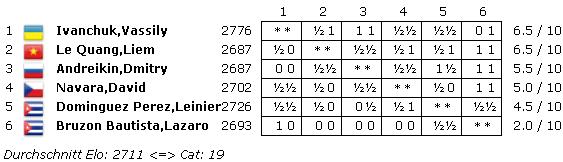 Havanna (CUB) - Vom 10. bis 21. Mai fand in Kubas Hauptstadt das 46. Capablanca Memorial statt. Das Hautoturnier war ein starkes GM-Turnier mit sechs Spielern, welches doppelrundig ausgetragen wurde - also über zehn Runden lief. Gewonnen hat das Turnier der Kategorie 19 mit Vassily Ivanchuk der erklärte Favorit. Der Ukrainer erzielte bei drei Siegen und einer Niederlage 6,5 Punkte und musste in der Endabrechnung die Sonneborn-Berger-Wertung bemühen, um den punktgleichen Vietnamesen Liem Quang Le auf den zweiten Rang zu verweisen. Vor der letzten Runde hatte noch Quang Le mit einem Zähler Vorsprung geführt, aber als hätte Hollywood das Finale geschrieben, musste er eben gegen Ivanchuk antreten und wurde von diesem in einem Tarrasch-Franzosen nach und nach ausgespielt. Dritter wurde mit einem Punkt Rückstand der einzige russische Teilnehmer Dmitry Andreikin.