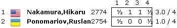 St. Louis (USA) - Im von Tornados heimgesuchten Mittelwesten der USA trafen sich vom 16. bis 25. Mai Hikaru Nakamura und Ruslan Ponomariov zu einem Mix-Match aus langsamen und schnellen Schach. Zunächst wurden sechs Partie mit langer Bedenkzeit gespielt und wurden dann noch von vier Schnellschachpartien garniert. Den gleichen Modus spielten parallel an gleicher Stätte auch der amerikanische Jung-GM Ray Robson gegen seinen Landsmann IM Benjamin Finegold. Nach turbulentem Matchverlauf und sogar einer Unterbrechung aufgrund von Tornado-Warnungen konnte Nakamura mit 3,5:2,5 das langsame Schach für sich entscheiden und im Schnellschach deutlich mit 3:1 siegen. Robson hatte seinen Gegner beim 4:2 mit klassischer Bedenkzeit noch etwas deutlicher im Griff, aber dafür kam er im Schnellschach nicht über ein 2:2 hinaus. Letzten Endes wird bei allem Spaß, den alle Spieler gehabt haben wollen, der Trainingseffekt besonders für Nakamura und Robson im Vordergrund gestanden haben. Beide spielen garantiert mit dem Gedanken, eines Tages mal Weltmeister werden zu wollen und dafür benötigt man - zumindest im Moment - Erfahrung im "Heads-Up".