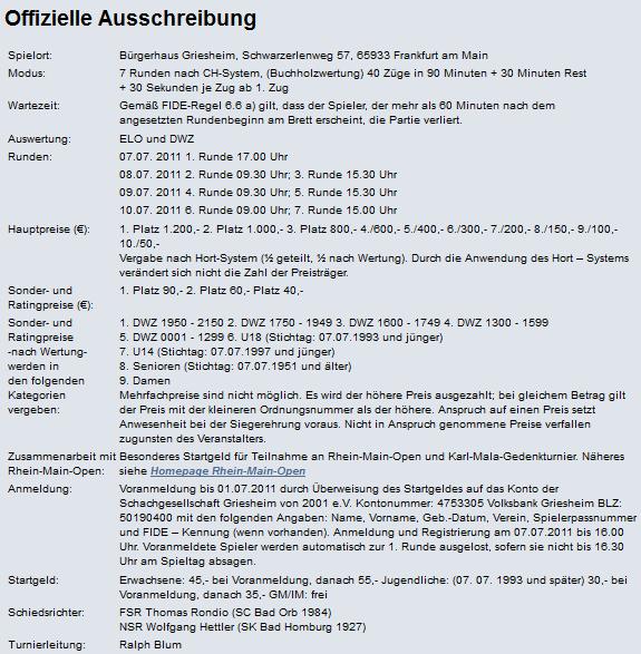 Nachrichten XIV. Karl-Mala-Gedenkturnier 2011 kurz vor dem Start Frankfurts größtes Open vom 07. bis 10. Juli - Bisher 185 Spieler gemeldet