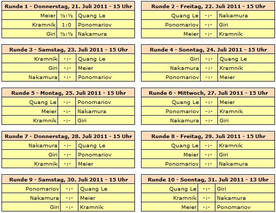 Mit einem ELO-Schnitt von 2731 wird die Turnierkategorie 20 erreicht. Rundenstart ist täglich um 15:00 Uhr, lediglich die letzte Runde beginnt bereits um 13:00 Uhr. Wie schon in den Vorjahren werden die Partien mit einer Verzögerung von 15 Minuten ins Internet übertragen. Ein Ruhetag wird eingelegt - nämlich am 26. Juli.