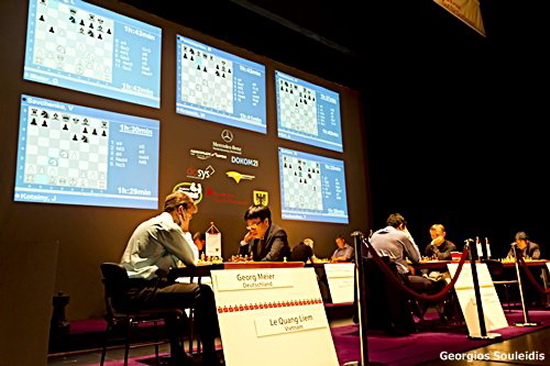 21.07.2011 - Während sich zwei der drei Erstrundenpartien des diesjährigen Sparkassen Chess-Meetings von Beginn an langsam bis schwerblütig entwickelten, legten Georg Meier und Liem Quang Le auf der Bühne des Schauspielhauses eine flinke Sohle aufs Parkett. Offensichtlich kannten sich beide in der Grünfeld-Variante perfekt aus und hatten rasch ein totremises Turmendspiel auf dem Brett. Tapfer quälten sie sich noch ein paar Züge lang, doch dann hatten sie genug und schaukelten sich nach knapp 2 Stunden per dreimaliger Stellungswiederholung ins gerechte Remis. Zu diesem Zeitpunkt befanden sich die anderen Partien noch im Eröffnungsstadium! Den längsten Arbeitstag hatten Anish Giri und Hikaru Nakamura. Auf Umwegen wurde eine Stellung der Abtauschvariante des Damengambits erreicht, in welcher der Amerikaner überraschend viel Zeit benötigte. Alsbald verpasste ihm sein junger Gegner die schlechtere Bauernstruktur, doch Nakamura kreierte ausreichend Gegenspiel. Zum Ende fabrizierten beide eine nette Dauerschachkombination zur Punktteilung. Zwischen Vladimir Kramnik und Ruslan Ponomariov stand die Königsindische Verteidigung zur Diskussion, in welcher bald neue Pfade beschritten wurden. Mit einem starken Qualitätsopfer riss Kramnik in der Folge die Initiative an sich, eroberte alsbald das investierte Material plus Mehrbauer zurück und hatte mit der Verwertung der Stellung keine weiteren Probleme.