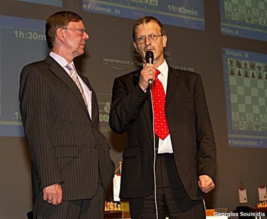 Zum Auftakt des Sparkassen Chess-Meeting überließ Veranstaltungsleiter Gerd Kolbe dem Hauptsponsor in Person von Uwe Samulewicz (Vorsitzender des Vorstandes der Sparkasse Dortmund) das Mikrophon