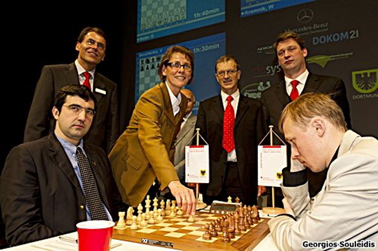 Den ersten Zug des Turniers führte Dortmunds Bürgermeisterin Birgit Jörder unter den Augen von Uwe Samulewicz, Herbert Bastian und Turnierdirektor Stefan Koth bei Vladimir Kramnik und Ruslan Ponomariov aus
