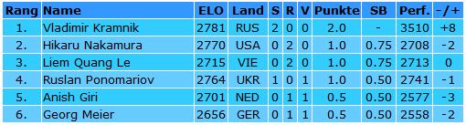 Die Teilnehmer am Sparkassen Chess-Meeting 2011 Georg Meier (2656), Liem Quang Le (2715), Vladimir Kramnik (2781), Ruslan Ponomariov (2764), Anish Giri (2701) & Hikaru Nakamura (2770)