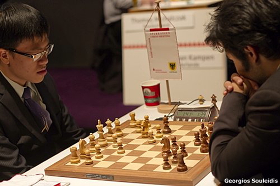 22.07.2011 - Die zweite Runde des Sparkassen Chess-Meeting in Dortmund wird Georg Meier lange und schmerzlich in Erinnerung bleiben. Der Deutsche spielte eine gute Partie gegen Vladimir Kramnik und schien leicht besser zu stehen, als er dem Russen eine Zugwiederholung anbot. Doch im letzten Moment schraubte der 14. Weltmeister das Risiko hoch und setzte auf unübersichtliche Verwicklungen. Damit kam Meier nicht zurecht und verlor erst den Überblick und dann die Partie. Bleibt zu hoffen, dass sich die deutsche Nummer 2 genauso gut von der Niederlage erholt, wie Ruslan Ponomariov. Gestern hatte der Ukrainer noch das Nachsehen eben gegen Kramnik, dafür hielt er sich heute an Anish Giri gütlich. Die wenigste Spannung kam zwischen Liem Quang Le und Hikaru Nakamura auf. Nach nur 22 Zügen hatte man zum dritten Mal die gleiche Stellung auf dem Brett und damit die "Anti-Remis-Regel" aus den Angeln gehoben.