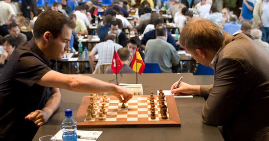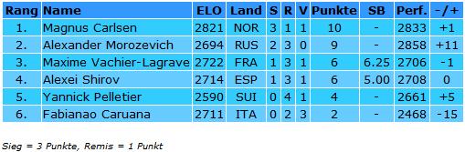 23.07.2011 - Rechtzeitig zur Halbzeit ist das ACCENTUS-Grandmaster Tournament in Biel wieder spannend. Während der bisher souverän führende Magnus Carlsen in einer spannenden Partie Maxime Vachier-Lagrave unterlag, konnte Alexander Morozevich gegen Fabiano Caruana gewinnen und so den Abstand auf einen Punkt (in Biel ein Remis) verringern. Die ganze Partie über hatte Vachier-Lagrave einen soliden Vorteil dazu genutzt, seinen norwegischen Gegenüber zu quälen, verpasste aber mindestens ein Mal den direkten Gewinn. Dennoch ist der Sieg für den Franzosen absolut verdient und für die Spannung im Turnier natürlich eine Wohltat. Die dritte Partie des Tages zwischen Yannick Pelletier und Alexei Shirov endete gerecht remis. Morgen ist der zweite Ruhetag, bevor es am Montag in die zweite Turnierhälfte geht, welche dann ohne Pause durchgespielt wird. Interessant für Statistiker und Verfechter der "1-Punkt-Regel": Morozevich würde nach Sonneborn-Berger-Wertung jetzt sogar vor Carlsen führen!