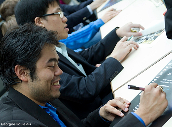 Da fand auch Hikaru Nakamura seine gute Laune wieder, nachdem er am Vortag noch 8 Stunden gegen Georg Meier kämpfen musste und dann auch noch kein Abendessen im Hotel bekam. Na ja, in der Ruhrmetropole Dortmund wird sich garantiert noch etwas Essbares für den Amerikaner gefunden haben...