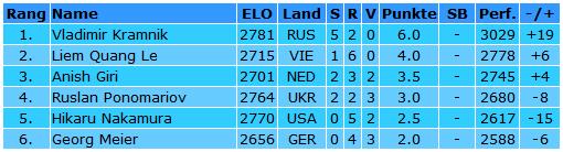 Die Teilnehmer am Sparkassen Chess-Meeting 2011 Georg Meier (2656), Liem Quang Le (2715), Vladimir Kramnik (2781), Ruslan Ponomariov (2764), Anish Giri (2701) & Hikaru Nakamura (2770)