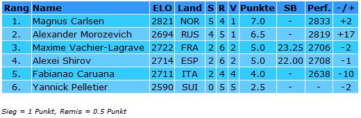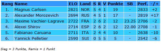 Rang 3 nach Wertung für Maxime Vachier-Lagrave. Der Franzose spielte interessant und nimmt einen Sieg gegen Carlsen mit aus Biel. Dennoch hatte er sich vermutlich den einen oder anderen Punkt mehr erhofft.