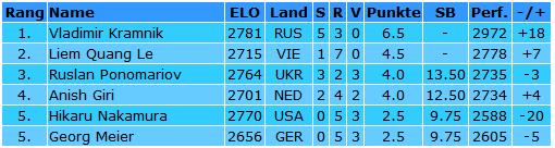 Die Teilnehmer am Sparkassen Chess-Meeting 2011 Georg Meier (2656), Liem Quang Le (2715), Vladimir Kramnik (2781), Ruslan Ponomariov (2764), Anish Giri (2701) & Hikaru Nakamura (2770)